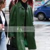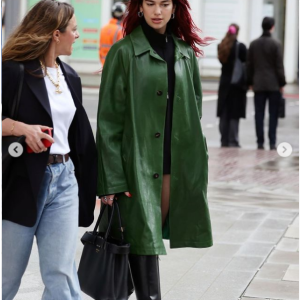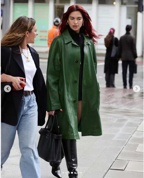 Dua Lipa vista hoy en Londres Green Leather Coat