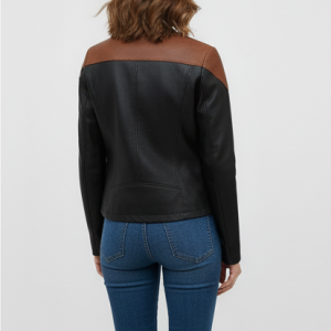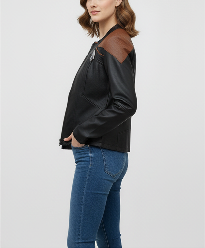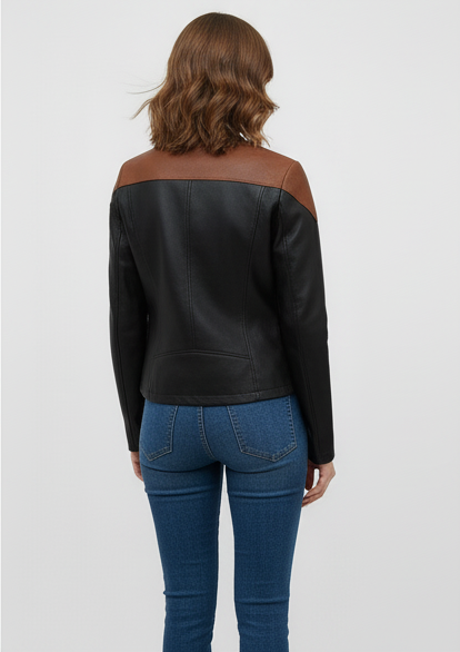 The jacket is a fan favorite and has gained recognition not only on screens but also on the streets. Ideal as relaxed or bold outfits, it demonstrates that film-inspired fashion can flourish in everyday closets. The jacket is made of comfortable real leather and has an inner viscose lining. You will have a front with a zipper closure that provides better wind and cold protection by creating a sealed front. The jacket with a round neck collar provides support to the cervical spine. The jacket keeps you warm in the chilly weather. Moreover, it features a black outer layer adorned with brown perforated shoulder panels, offering a striking and unique appearance. Furthermore, the full-length sleeves enhance its sophisticated style.
