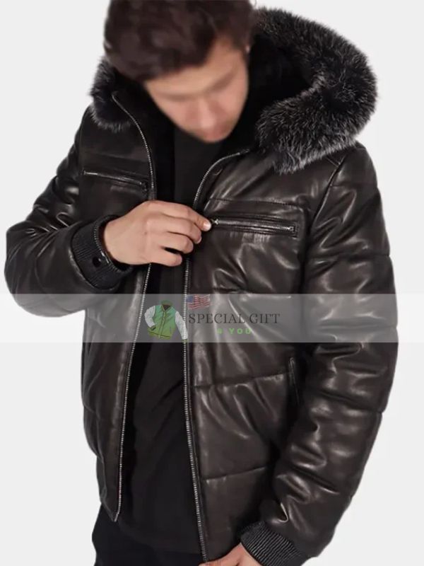 Tony Black Leather Hooded Jacket Fur Collar
